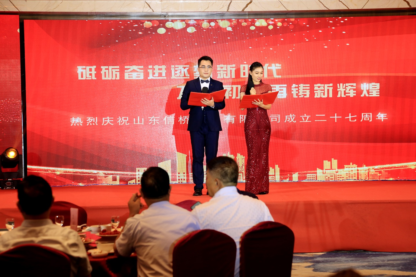 此次慶典晚宴參加人員除了信橋全體員工之外,還有部分老領(lǐng)導(dǎo)和老朋友,大家共同分享了信橋二十七周年的喜悅與精彩。八號(hào)上午,慶典開始之前,演員們辛勤排練,燈光師、音響師共同配合,所有人為了晚會(huì)都在努力。下午4點(diǎn)58分,晚會(huì)正式開始,全體員工與領(lǐng)導(dǎo)集體合影,信橋隊(duì)伍不斷在擴(kuò)大。今年的晚會(huì)添加新的互動(dòng)方式,采用了直播和紅包雨的新形式,是信橋周年慶典的一次新的嘗試。